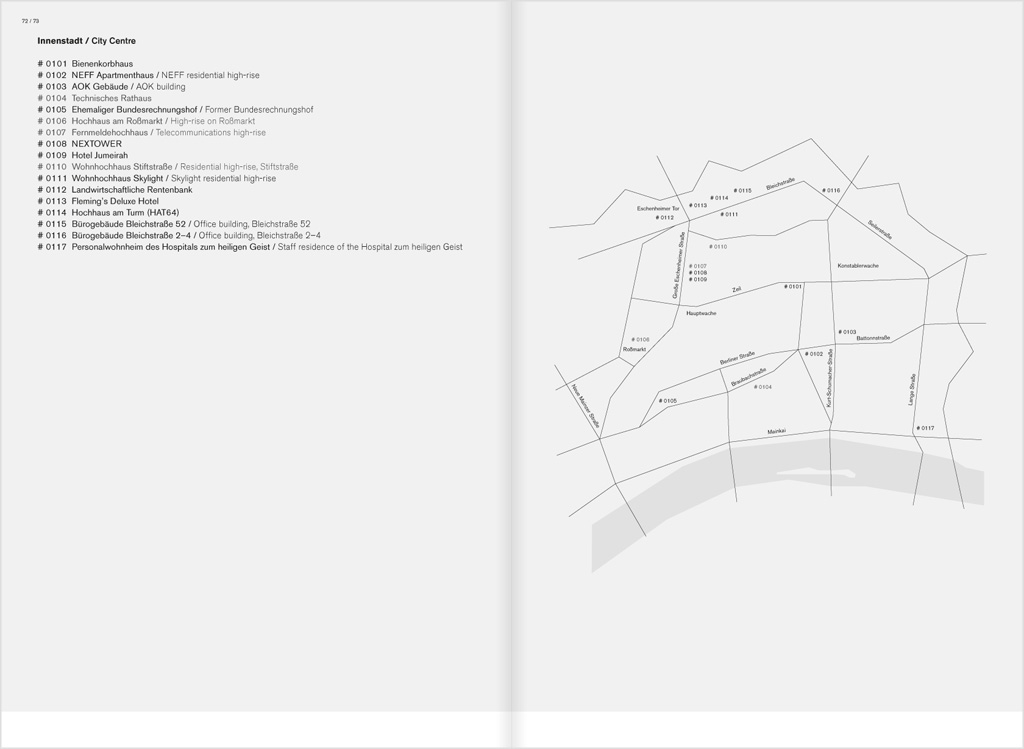 Ausstellungskatalog und Übersicht aller Hochhäuser, die je in Frankfurt standen, stehen oder stehen sollten. Das Buchlayout wächst, bricht und verdichtet sich wie die Stadt selbst.